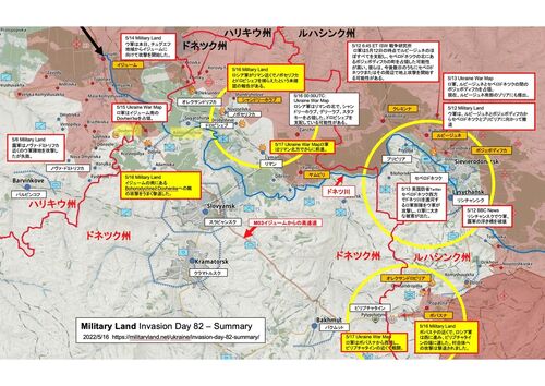 5月17日火曜日 ウクライナ東部戦況 Military Land 地図に最新情報を追加。 https://militaryland.net/ukraine/invasion-day-82-summary/ummary/ 5月16日 月曜日 Military Land: ・ウクライナ軍は、イジューム南方のBohorodychneとDovhenkeへの敵の攻撃をうま…